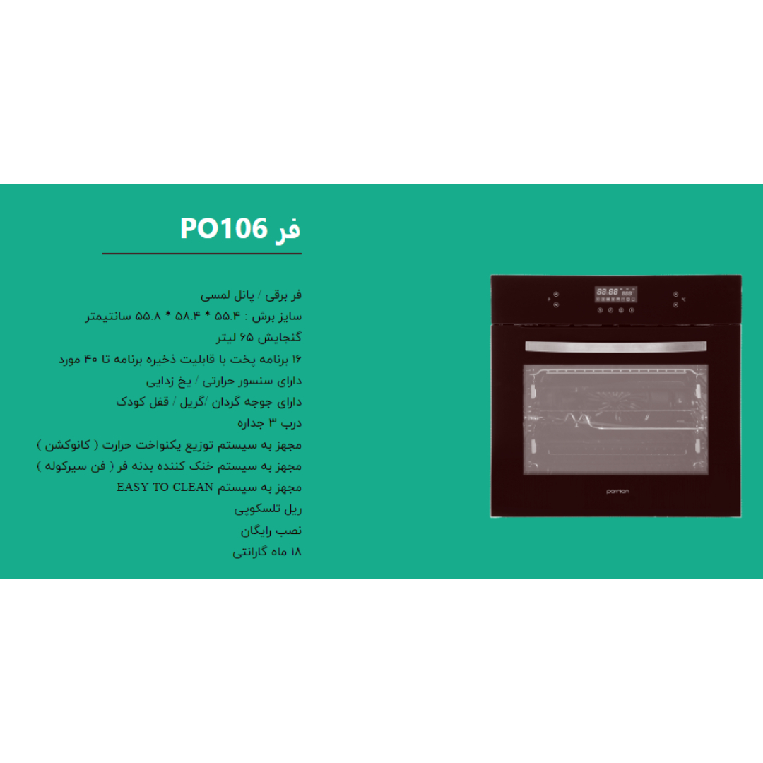 فر توکار برقی پرنیان استیل مدل PO-106 با پنل شیشهای و عملکرد پیشرفته