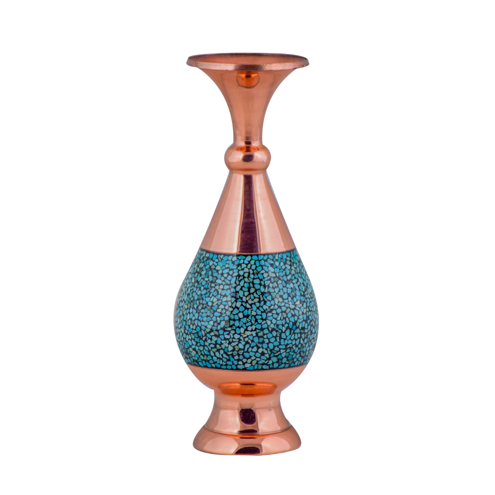 در دل این گلدان فیروزهکوب، تلفیق هنرمندانهٔ مس درونی و لایهٔ خارجی فیروزه، جلوهای از زیبایی شناسی اصیل ایرانی را به نمایش میگذارد. الگوهای منظم و ظریف نقشبرجسته، گواه بر دقت و خلاقیت بیمانند استادکاران کارگاه آقاجانی است و با ارتفاع ۲۰ سانتیمتر و وزن ۲۷۲ گرم، هم در دکوراسیون منزل جایگاه ویژهای دارد و هم به عنوان ظرفی مقاوم برای گلآرایی مصرف میشود. این اثر در همه مراحل، از طراحی تا ساخت، در کارگاه صنایع دستی آقاجانی شکل گرفته و ریشه در سنتهای کهن سفالگری و فلزکاری ایرانی دارد.
